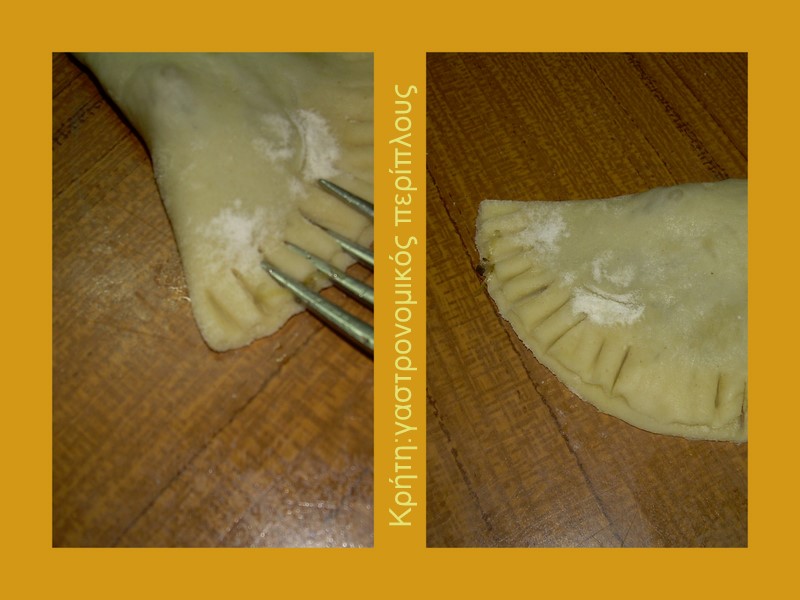 Ανοίγουμε λεπτό φύλλο με το ξυλίκι (έτσι λέμε εμείς τον πλάστη) ή με τη μηχανή χρησιμοποιώντας και λίγο αλεύρι στο άνοιγμα αν χρειάζεται. Κόβουμε στρογγυλά φυλλαράκια με διάμετρο 12 περίπου εκατοστά και βάζουμε μια ποσότητα χόρτων στο μισό τους όπως φαίνεται στη φωτογραφία. Τα σκεπάζουμε και τα κλείνουμε είτε με «τσιμπήματα» είτε με ένα πιρούνι .