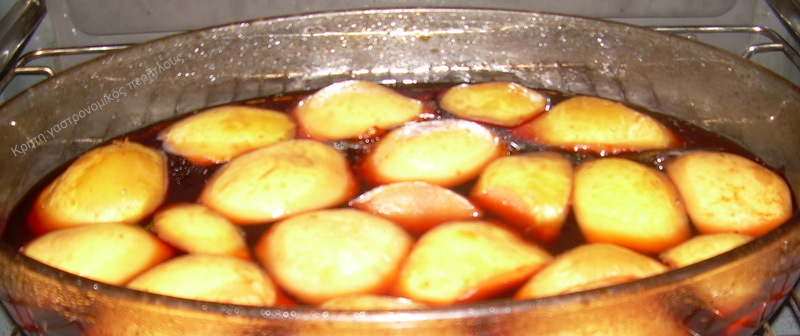 Τα στρώνουμε σε πυρέξ που να τα χωράει ίσα ίσα, με τα φλούδια προς τα πάνω, και τα περιχύνουμε με το μίγμα της κατσαρόλας, χωρίς να αφαιρέσουμε τα μπαχαρικά.(Αν τα βάλουμε σε πολύ μεγαλύτερο σκεύος το υγρό θα είναι σε μικρότερο ύψος απ’ ότι πρέπει).