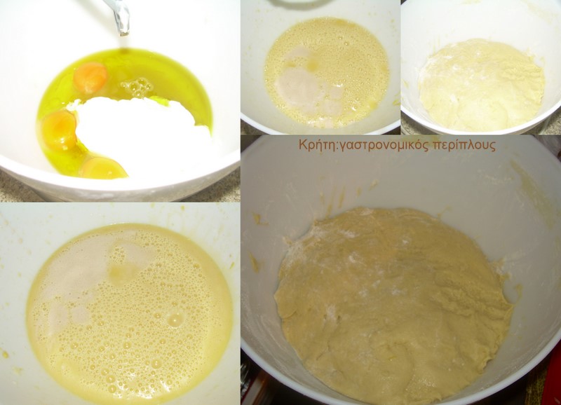 Με τα τρία πρώτα υλικά της ζύμης φτιάχνουμε ένα χυλό και τον αφήνουμε να φουσκώσει. Ωστόσο χτυπάμε στο μίξερ το λάδι, τα αυγά, τη ζάχαρη, και το γιαούρτι περίπου για 15 λεπτά σε μεσαία ταχύτητα.