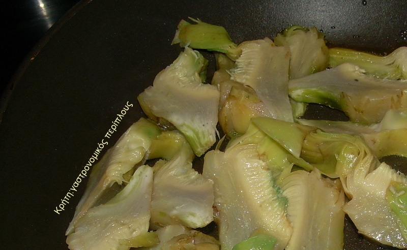 3) Στην ομελέτα με τις αγκινάρες ταιριάζουν πολύ και τα ασπρομανίταρα κομμένα σε φετούλες. Τότε τα σωτάρουμε πρώτα ελαφρά στο λάδι να μαραθούν και μετά προσθέτουμε τις αγκινάρες.