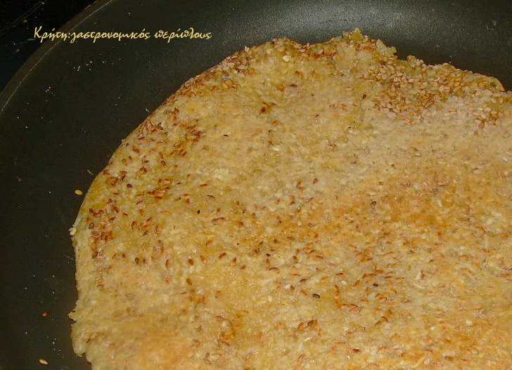 Βάζουμε να κάψει μαντεμένιο ή αντικολλητικό τηγάνι, το πασπαλίζουμε σε όλη του την επιφάνεια με σουσάμι και παίρνουμε μια μπάλα ζύμης ανάλογη με το μέγεθος του τηγανιού. Την απλώνουμε με το χέρι μας προσεκτικά σε όλη την επιφάνεια του τηγανιού. Χαμηλώνουμε τη θερμοκρασία αρκετά. Όταν στερεοποιηθεί και κάνει κρούστα από την μια μεριά την γυρίζουμε όπως την ομελέτα με ένα πιάτο ή με άλλο λείο σκεύος κατάλληλης διαμέτρου.