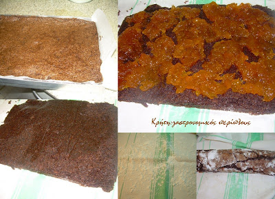 2)Παρόλο που το κλασικό παντεσπάνι το γυρίζουμε σε κορμό χωρίς τη γέμιση και όταν κρυώσει την προσθέτουμε, τούτο εδώ όσο και να ΄ναι δεν έχει την ελαστικότητα που δίνουνε τα αυγά οπότε το γεμίζουμε αμέσως και βοηθάμε στο τύλιγμά του με την πετσέτα.