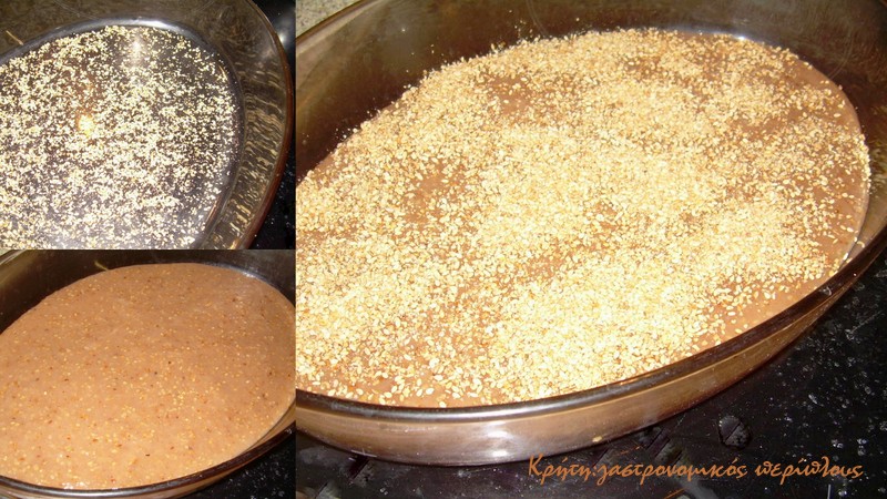 Ελέγχουμε την μουσταλευριά μας και όταν είναι έτοιμη (αν βάλουμε ένα κουταλάκι σε ελαφρά βρεγμένο πιατάκι , πρέπει να ξεκολλά όπως έγραφα στο προηγούμενο post ) προσθέτουμε το καρύδι και το σουσάμι και την αδειάζουμε σε σκεύος κατάλληλου μεγέθους ώστε να έχει πάχος 1,5- 2 εκατοστά.