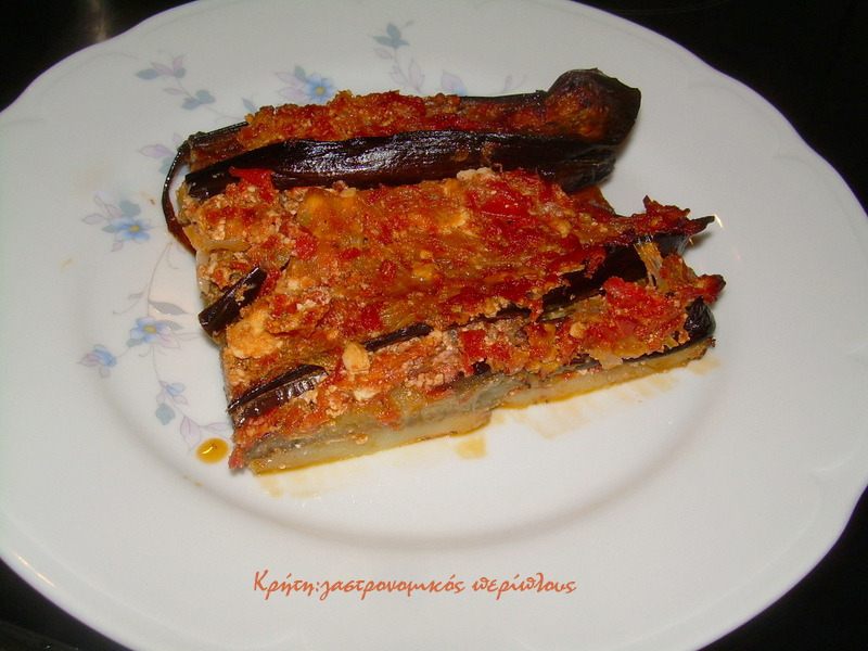 Με τις τελευταίες υπαίθριες μελιτζάνες της εποχής , ένα πιάτο απλό και νόστιμο για το καθημερινό μας τραπέζι. Απόλυτα λιτή γεύση αφού στην ουσία περιέχει 5-6 απλά υλικά : μελιτζάνες, πατάτες, ντομάτα, κρεμμύδι, ελαιόλαδο και ξινομυζήθρα ή φέτα. Αυτή είναι τουλάχιστον η αρχική του εκδοχή, στην οποία όμως οι μελιτζάνες και οι πατάτες τηγανίζονταν σε ελαιόλαδο.
