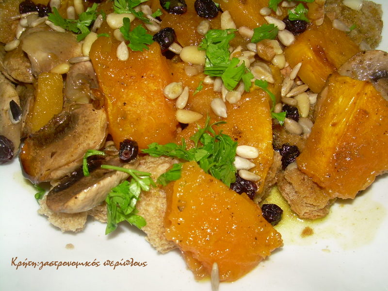 Το ψήσιμο παίρνει περίπου μισή ώρα, και τα ανακατεύουμε ενδιάμεσα προσέχοντας να διατηρηθούν ολόκληρα τα καρεδάκια της κολοκύθας.Όταν γίνουν, αφήνουμε να κρυώσουν ελαφρά . Σπάμε την κριθαροκουλούρα ή τα παξιμαδάκια σε μια ρηχή σαλατιέρα.Από πάνω απλώνουμε την κολοκύθα και τα μανιτάρια χωρίς να πάρουμε το ζουμί που έχει μείνει στο σκεύος που τα ψήσαμε. Προσθέτουμε τους ξηρούς καρπούς και τις σταφίδες .