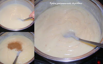 Όταν αδειάσουμε όλο το καυτό γάλα στο μπολ, ξαναγυρίζουμε το περιεχόμενό του στην κατσαρόλα και ανακατεύουμε συνεχώς σε χαμηλή προς μέτρια θερμοκρασία μέχρι να πήξει το μείγμα και να έχουμε μια βελούδινη κρέμα. Βάζουμε και το βούτυρο και την κανέλα και ανακατεύουμε . Τραβάμε την κατσαρόλα από το μάτι και σκεπάζουμε την κρέμα με μεμβράνη για να μην κάνει κρούστα.