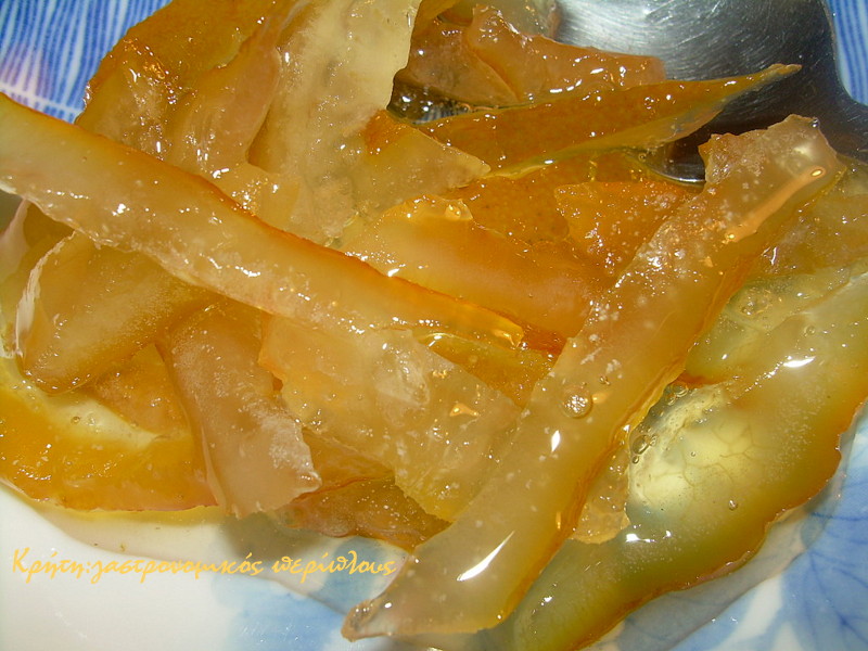 […] φλούδες γίνανε κατά ένα μέρος γλυκό με το γνωστό τρόπο, το ξύσμα έγινε τέσσερις «πάρτες»*. Η μια φυλάχτηκε […]