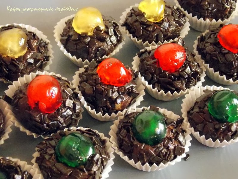 Συνήθως αυτά τα τρουφάκια-σοκολατάκια τα τυλίγω με τρούφα ή τρίμματα σοκολάτας και στη χριστουγεννιάτικη εκδοχή τα στολίζω και με μισό κερασάκι γλασέ. Αυτή τη φορά βρήκα πολύχρωμα κερασάκια, και η εμφάνισή τους είναι πιο εορταστική.